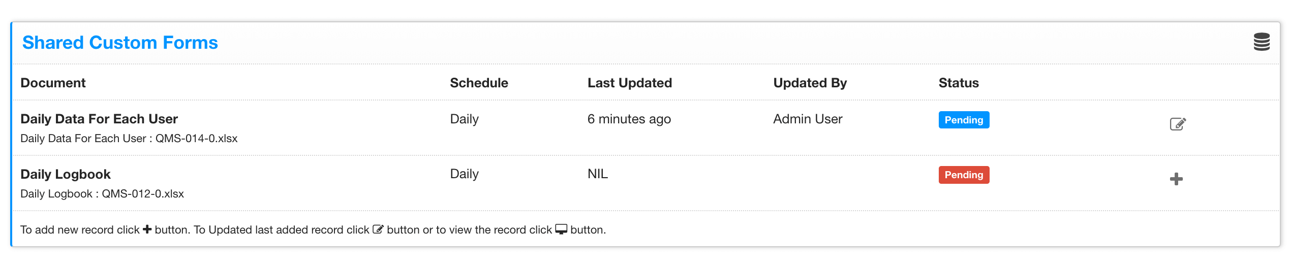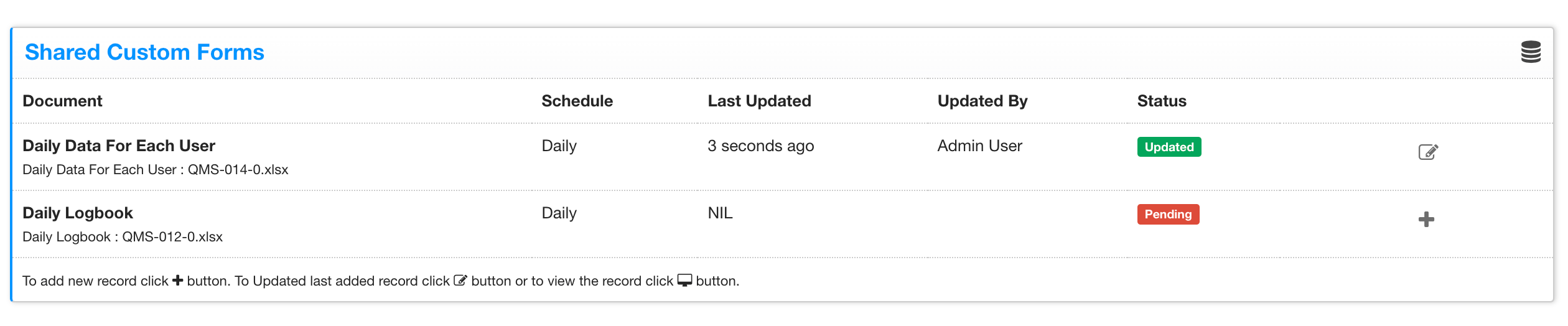 Once the Form is ready, this setting will start displaying a new HTML Form on user's dashboard. All the users with whom this Form is shared will have to update this spreadsheet by clicking on (+) sign at the end of the Form's row. System will also display "Pending" for each user. if the user has already added the data, it will show status as updated and icon changes to Edit icon instead of add. Check image below: