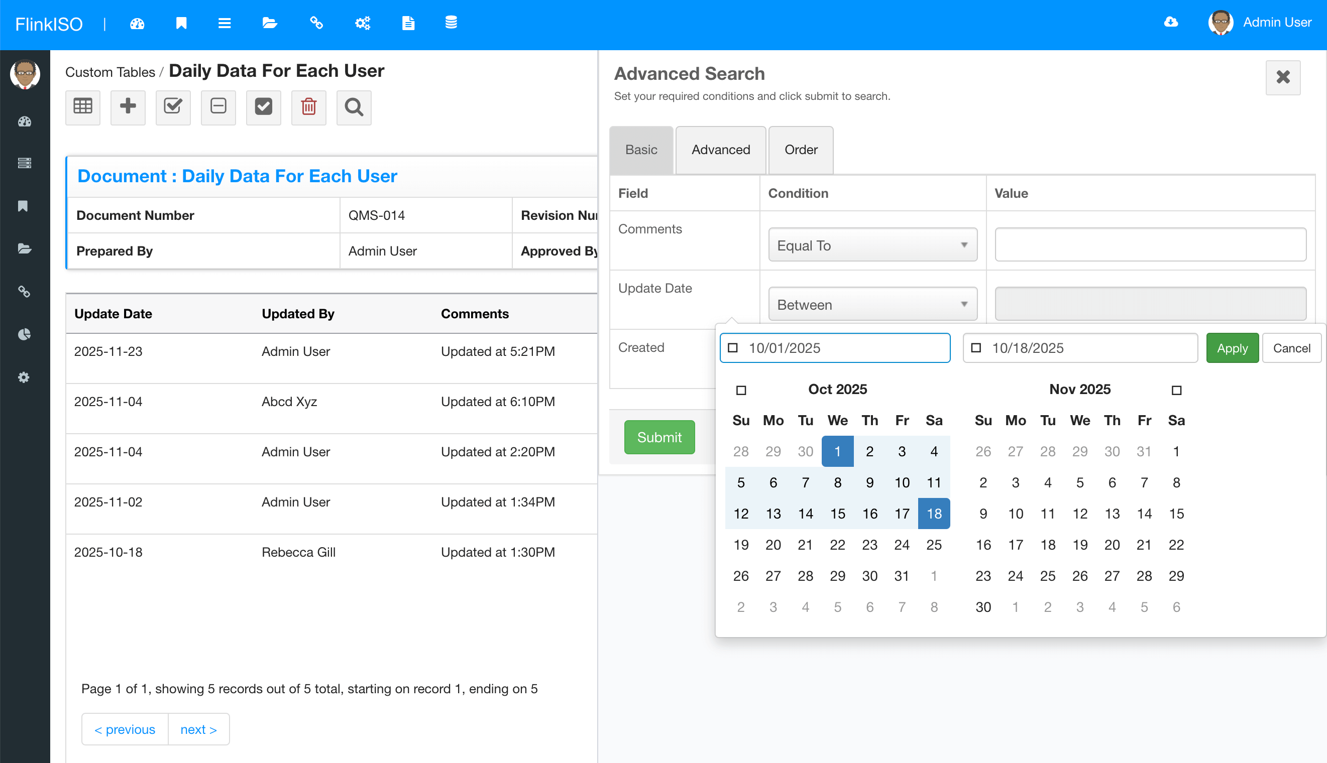 In these both the cases, system will open a same file for edit and every user with whom this file is shared has to update the single file. The HTML table will have very minimal fields like, 1. Who updated the file. 2. Update date. 3. Comments. Rest everything will be stored in an actual file (spreadsheet or a document). Admins can click and open the file by clicking on View/ Edit on Form's index page. Admins can also use search options to find updated records for based on date range or by users using search or advance search options.
