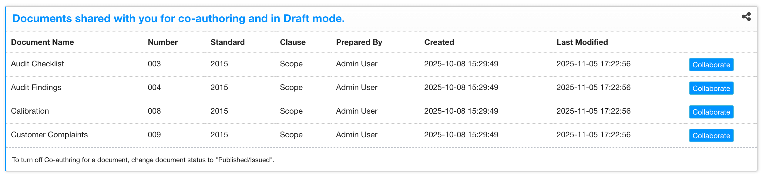 When a creator creates a document and when that document is in "Draft" mode, both the user and editors can simultaneously access the same document in Co-authoring mode. All such documents are displayed on user's dashboard. Users can click on "Collaborate" button to open the document for editing.