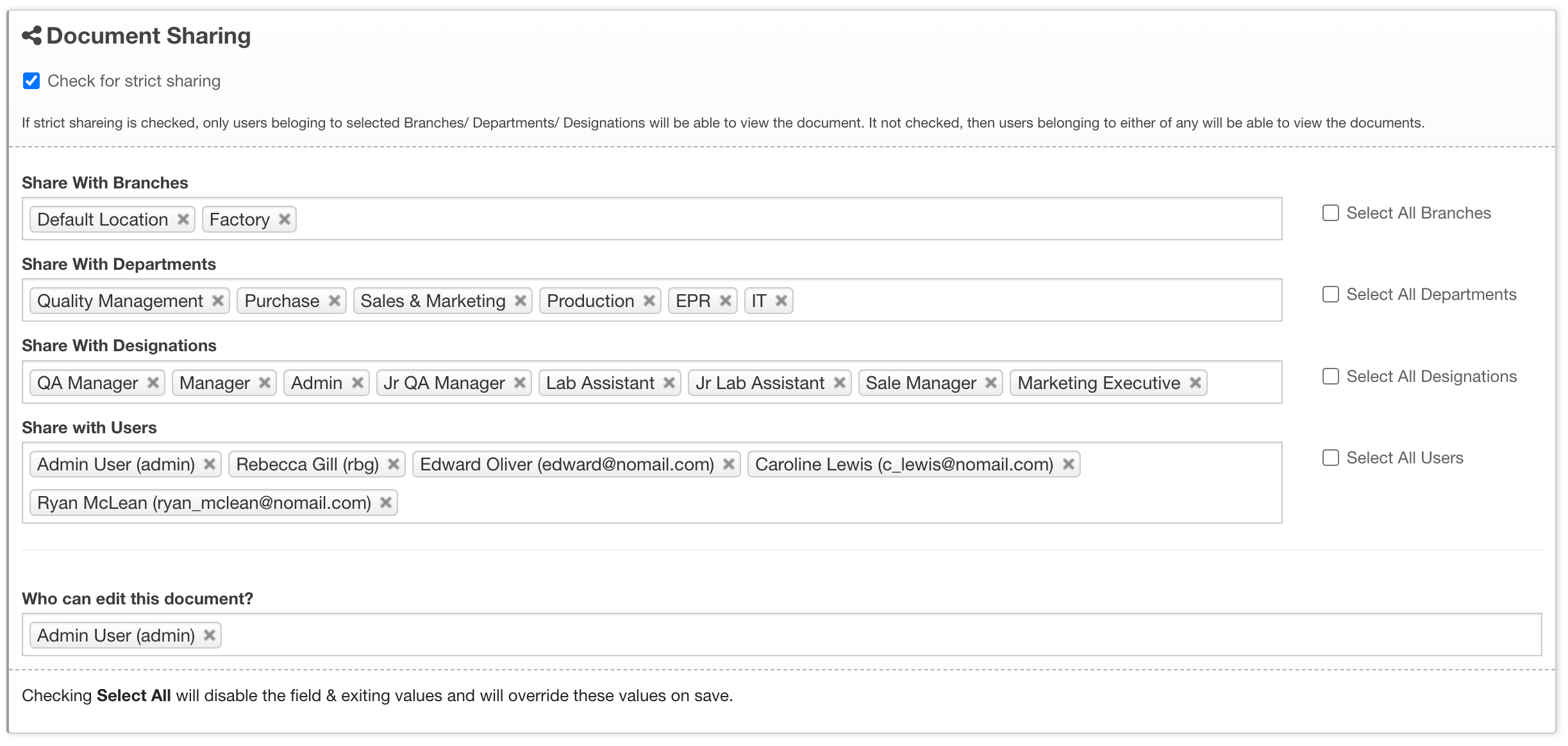 Strict Sharing: When checked, users matching Branch/ Department and Designation (all three) will have an access to the document. When not checked, users belonging to any of the Branch/ Department or Designation will have an access to the document.