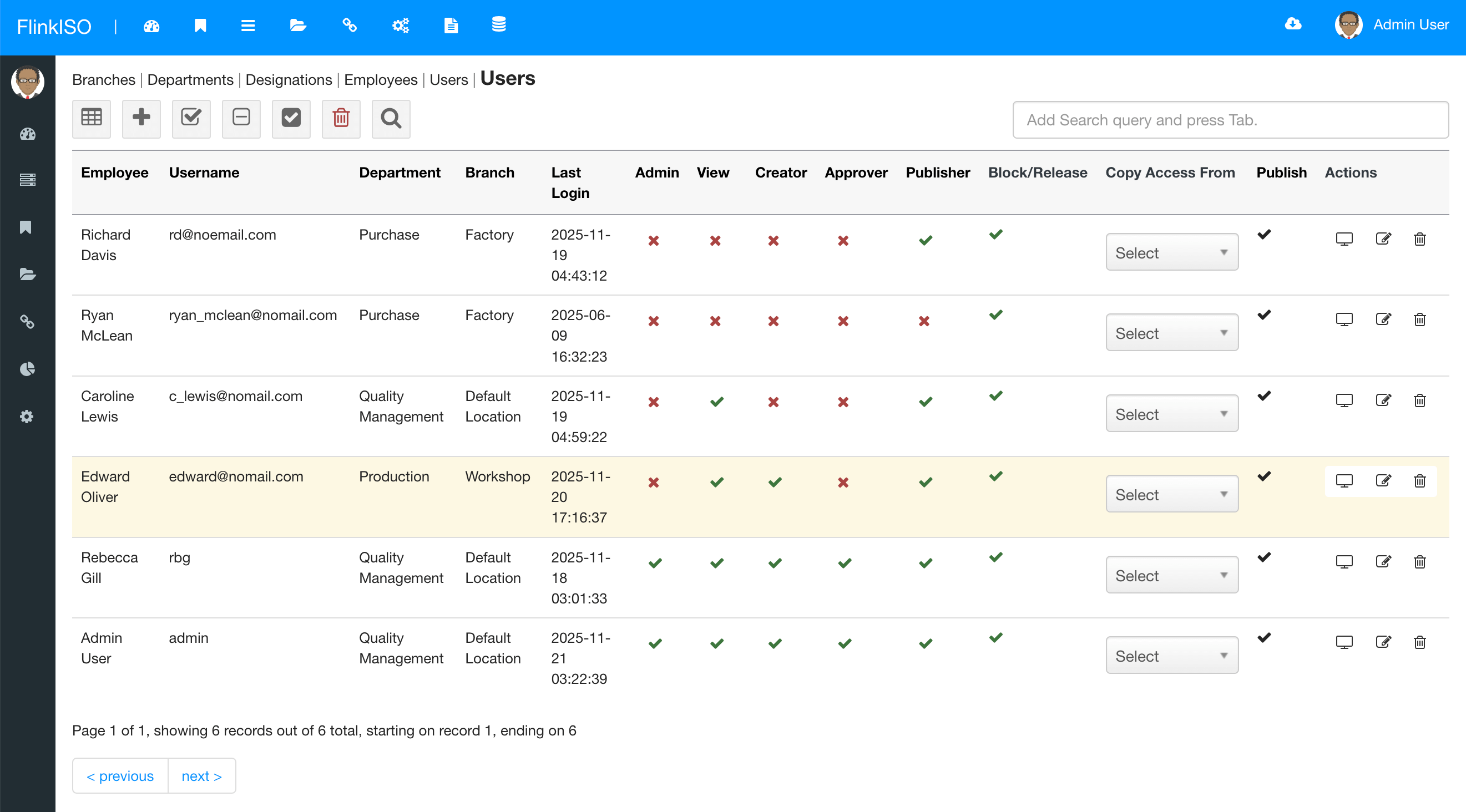 Refer to the image above for details. Users like Admin & Rebecca can create, view, approver & publish the documents. Users like Edward can create & view the documents but can not publish them without sending to either Admin or Rebecca while Caroline can only view the documents which are shared with her.