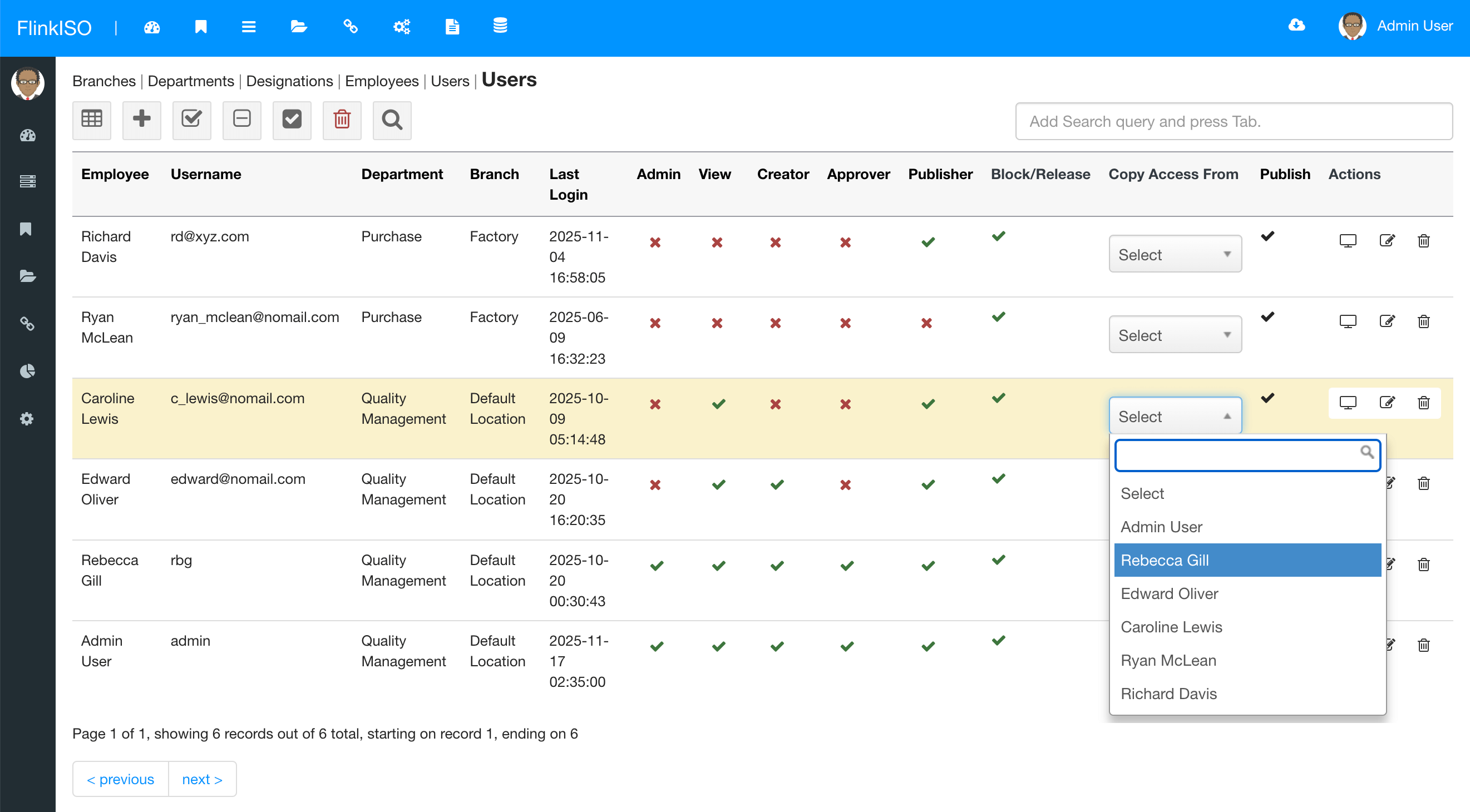 If you are creating an identical users, where the permissions/ access for new user is same (or almost same) as a user you have already created in past, then you can just copy all the access as it is from the existing user to new user by selecting the existing user from the drop-down. This will add all the access to QMS Documents/ Custom HTML Forms form the existing to new user. You can then additionally change other options (like creator/ viewer etc) from the index page by clicking on the check/ cross icons.