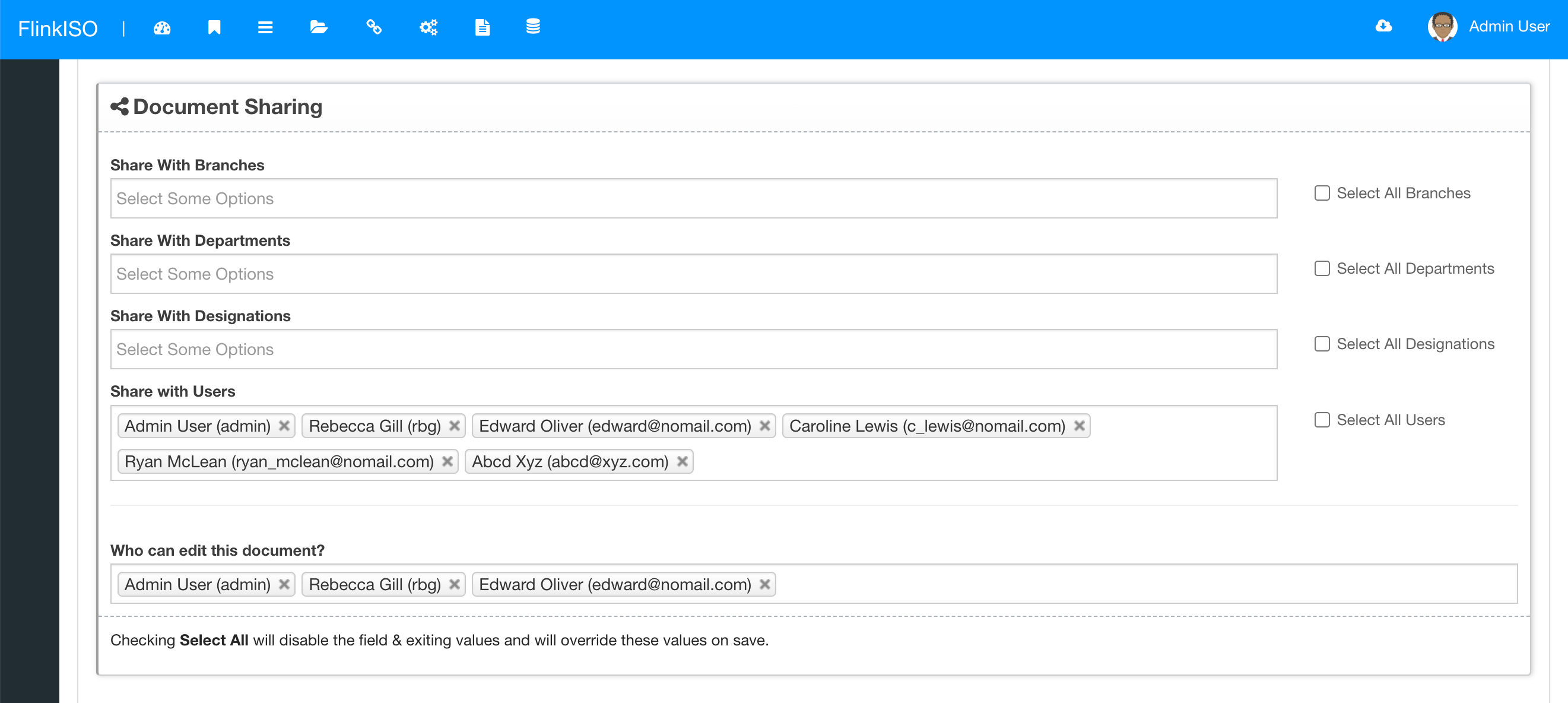 At 2nd layer of user access, document access to each and every user can be defined from the Document's add/ edit page. Under document's add/ edit page, you can define access to the users based of their branches, departments, designations or individual users. E.g. If the document is shared with "A" branch and "B" department, everyone from branch "A" and department "B" will be able to "View" that document. However, none of these uses will be able to Edit the document. You specifically have to define the Editors, (including the document creator) as editors. Only then a user will be able to edit the document.