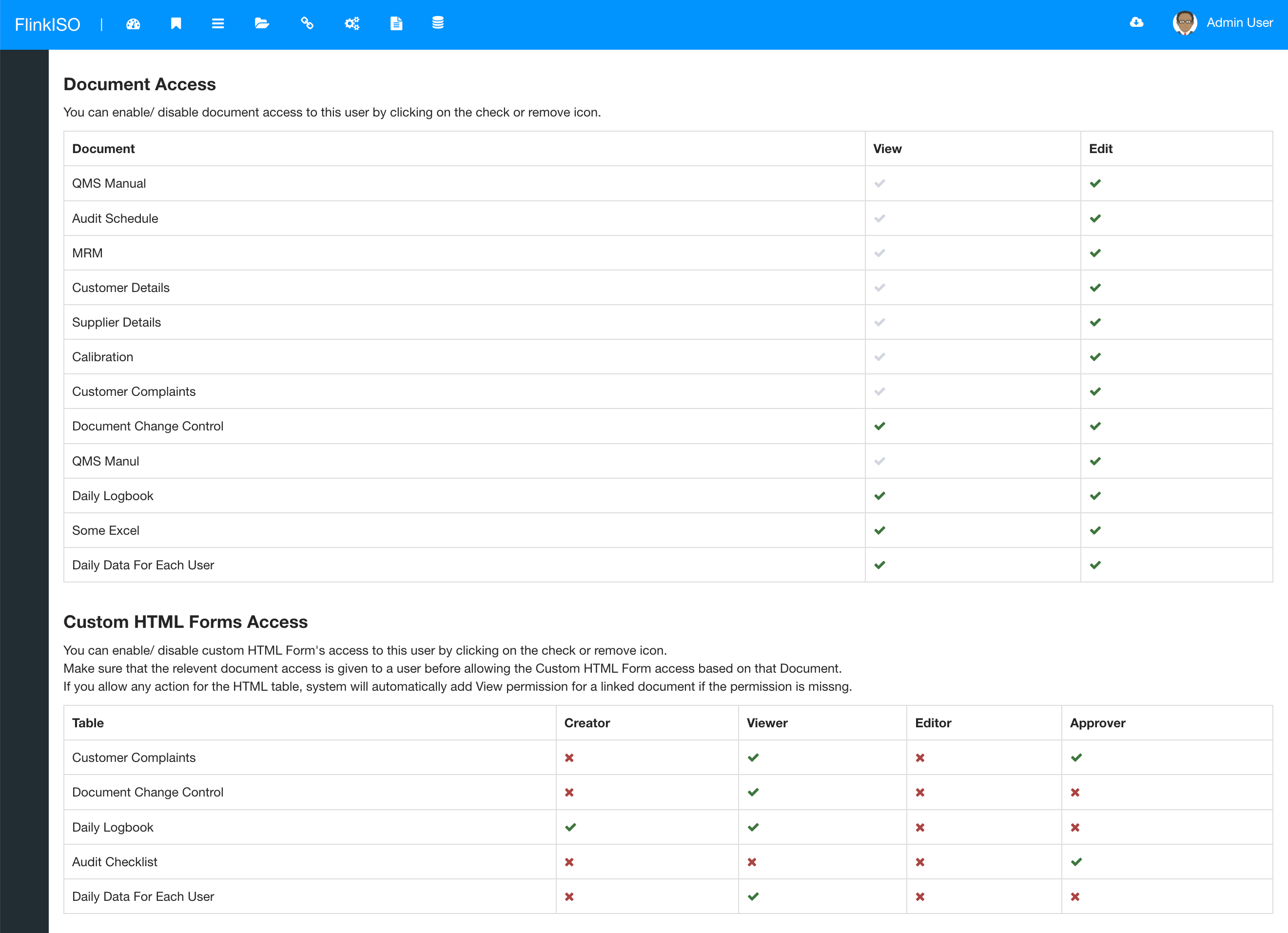 It is now made easy to re-define Document/ Custom HTML Table access for a single user without going through each and every document/ table. You can goto User's View page and system will display all the available documents & Custom HTML Forms. You can then check/ uncheck the access for each document/ Custom HTML Form. This feature is very useful when you add a new user post QMS setup. Note that if a Document is shared with entire branch/ department/ designation, then it will be automatically be shared with a user and check mark will be grayed out.