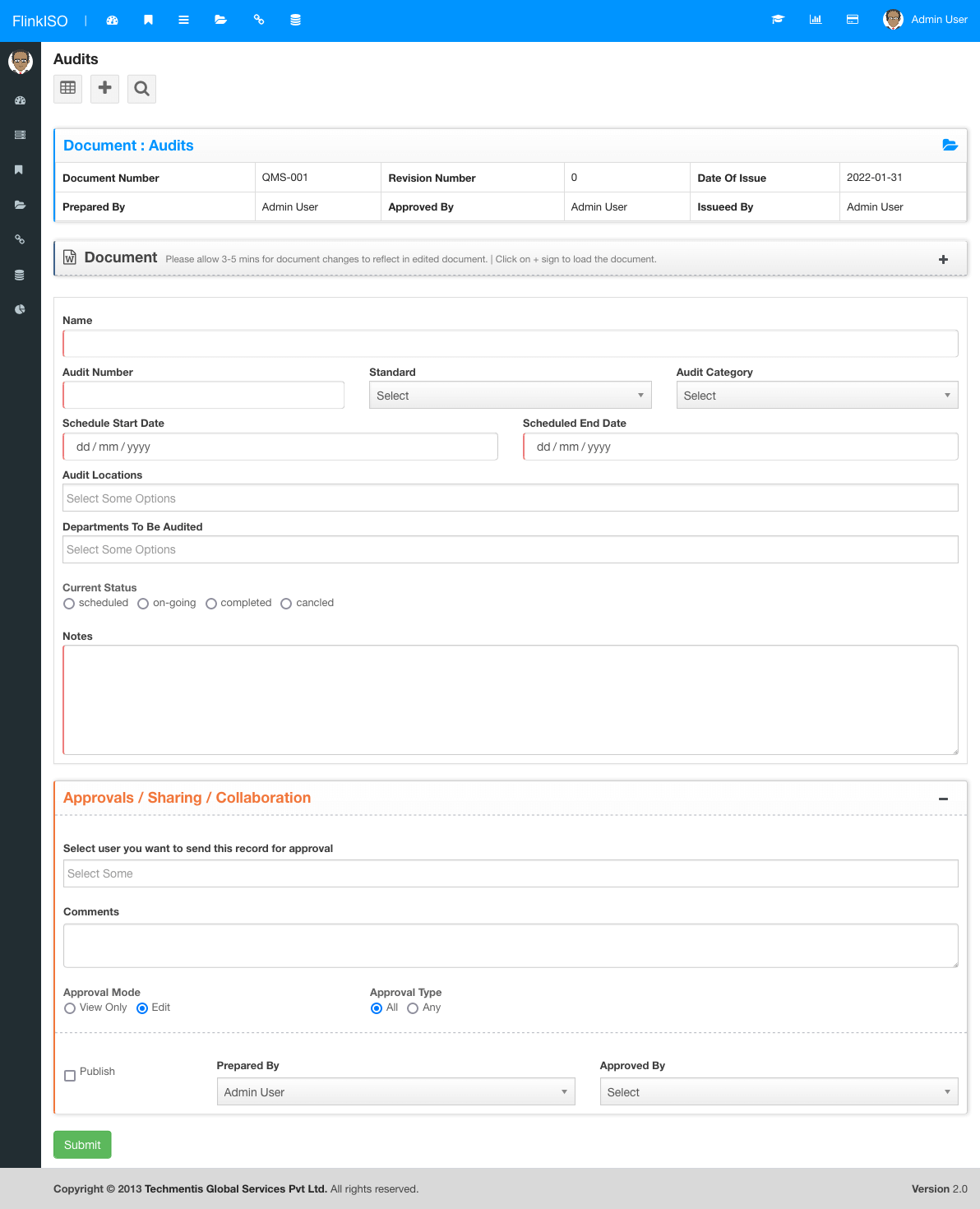 Along with these fields, other fields like, Prepared By, Approved By are also available. An Audit document which you have created earlier is also available at the top section of the form. Complete audit schedule can be added into the document and can be sent to all the stakeholders.